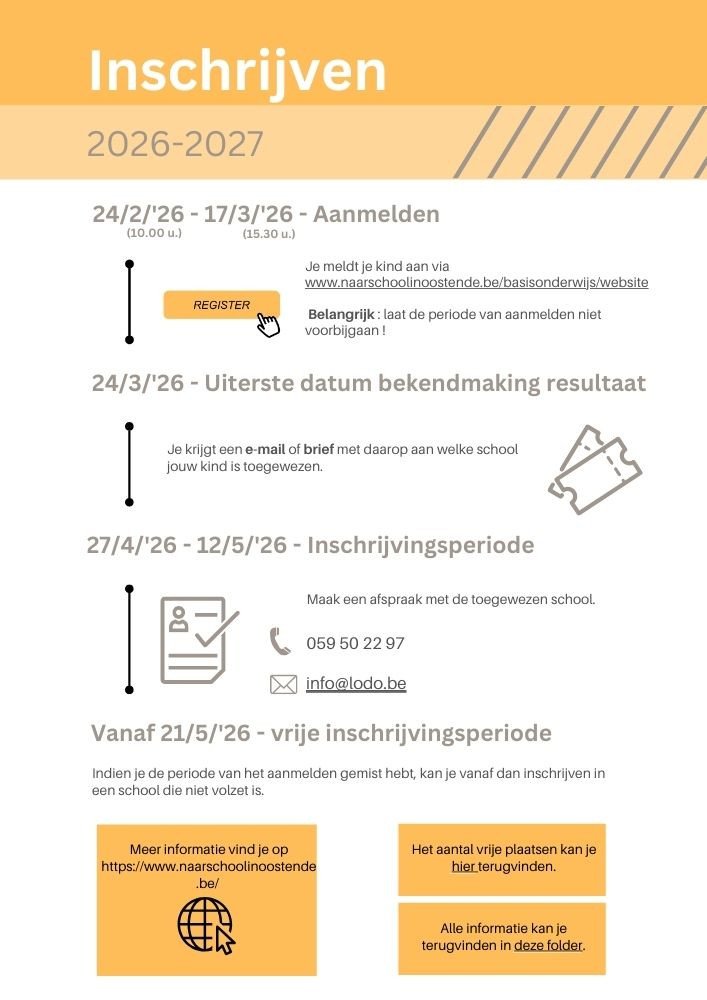 Wil je jouw kind op onze school inschrijven voor het schooljaar 2026-2027 dan zal je eerst jouw kind digitaal moeten aanmelden via de website www.naarschoolinoostende.be .